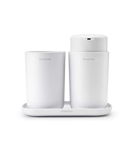 Brabantia ReNew 3 Piece Bathroom Accessory Set (White) Refillable Handwash Soap Dispenser, Toothbrush Holder & Tray