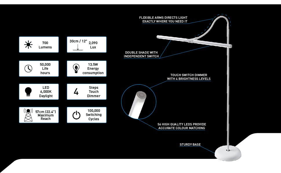 Lamp brightness: 2, 090 lux at 30cm (12”)