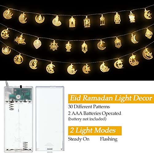 Solemn and Delicate Design: there are 30 different patterns on the string lights, and each of it has 15 patterns; There are stars, moons, castles, mosques, lanterns, and other elements in different combinations; The design adopts the solemn and sacred elements of Eid al Fitr, shining golden light in the dark for devout Muslims to pray