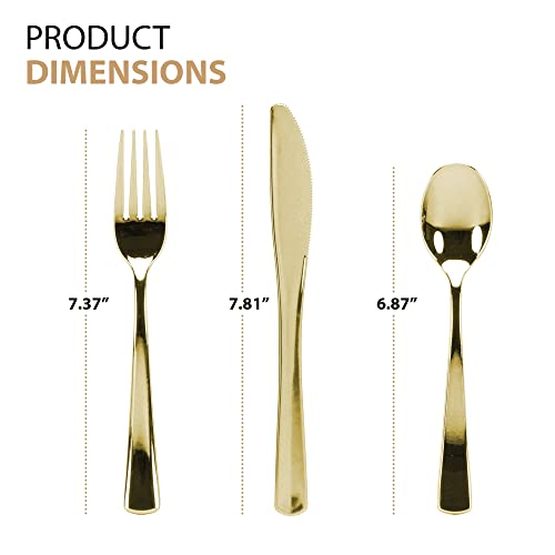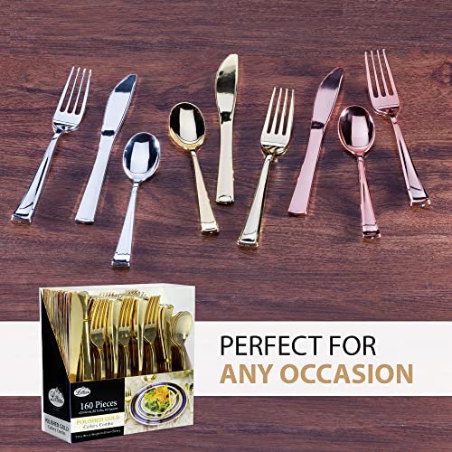 Lillian Tablesettings Plastic Cutlery Silverware Extra Heavyweight Disposable Flatware, Full Size Cutlery Combo, polished gold. VALUE PACK – 160 count, 80 Forks, 40 Spoons, 40 Knifes, boxed for easier storage.