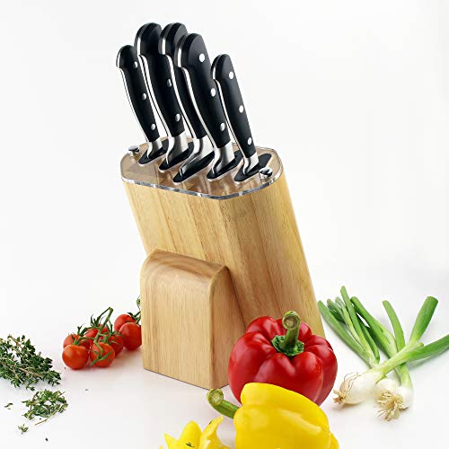 Featuring integrated sharpening steels in each knife slot, which hone straight knife edges each time they are removed and placed back into the block (bread knife slot does not contain a sharpener)