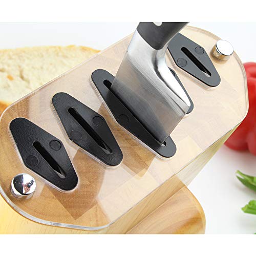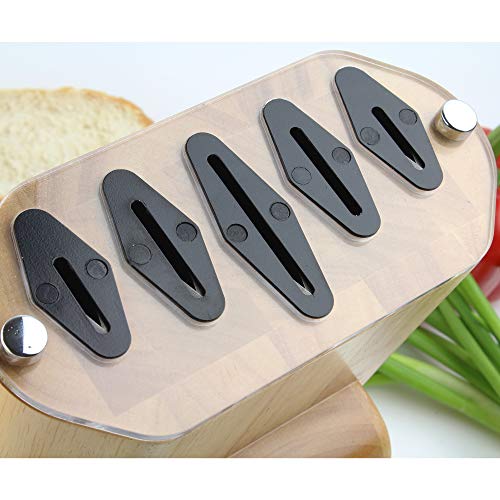 The Rockingham Forge SHARP’N knife block is easy to use, simply remove your chosen knife from the block and the integrated sharpening steel will sharpen the knife as it is pulled from the slot. The knife will then be sharpened again when re-entering the slot, ensuring that your knives are always sharp, it’s that easy! There’s no need to worry about your knives going blunt or buying an additional sharpener. The 5 Rockingham Forge knives within this set include a 20 cm chef knife, 20 cm carving knife, 20 cm bread knife, 14 cm utility knife and a 10 cm paring knife. Each of the knife slots, excluding the bread knife slot, contains a sharpener.
