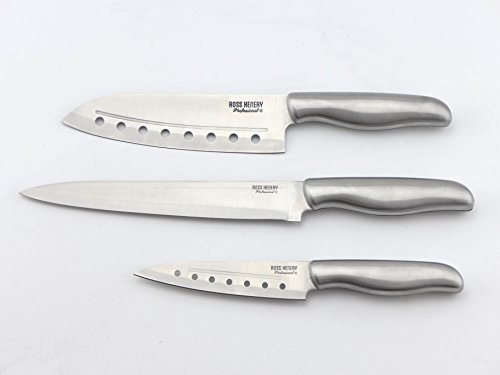 Ross Henery Professional 3 Piece Santoku Chef’s Knife Set in Wooden Gift Box with Built in Sharpener (Silver Handles)