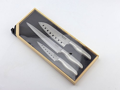 Set includes: 1 x Carving knife ,1 x Santoku Knife ,1 x Utility Knife and 1 x Wooden Gift box with sharpening corner