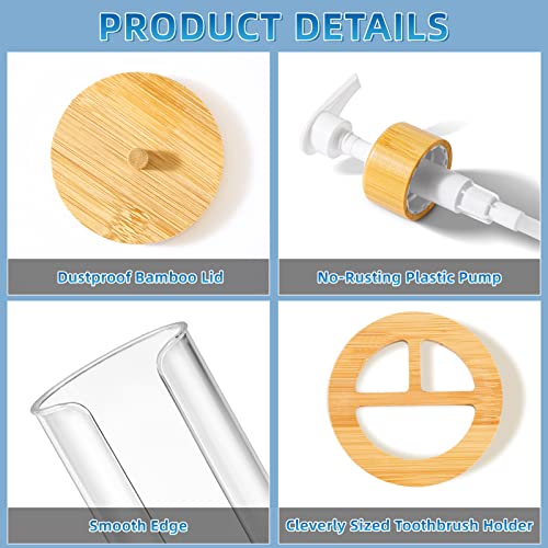 VITVITI 4 Pack Bamboo Bathroom Accessories Set, Clear Toothbrush Holder 17Oz Mouthwash Dispenser with Cup Holder, Floss…